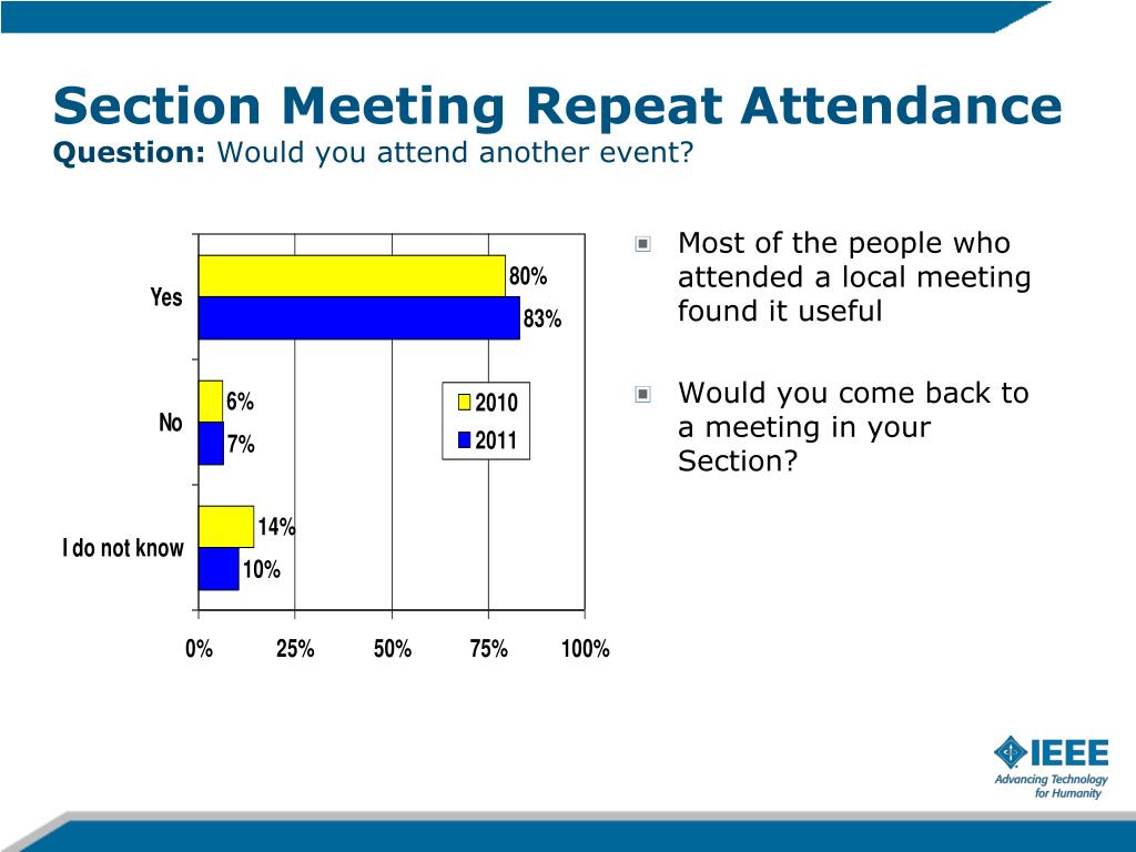 Section Meeting Repeat AttendanceQuestion: Would you attend another event? • Most of the people who attended a local meeting found it useful • Would you come back to a meeting in your Section?