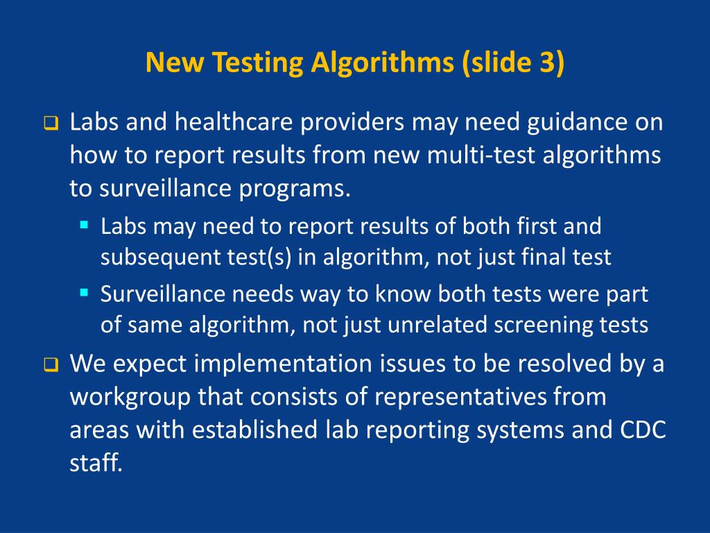 New Testing Algorithms (slide 3) • Labs and healthcare providers may need guidance on how to report results from new multi-test algorithms to surveillance programs. • Labs may need to report results of both first and subsequent test(s) in algorithm, not just final test • Surveillance needs way to know both tests were part of same algorithm, not just unrelated screening tests • We expect implementation issues to be resolved by a workgroup that consists of representatives from areas with established lab reporting systems and CDC staff.