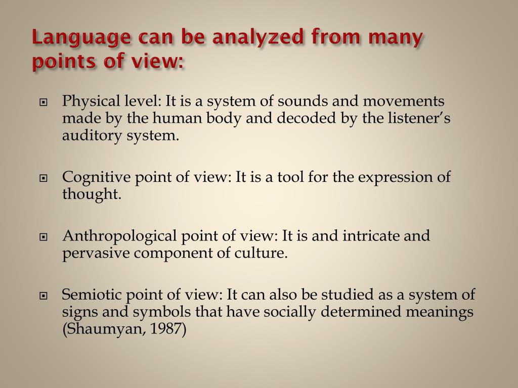 Language can be analyzed from many points of view: • Physical level: It is a system of sounds and movements made by the human body and decoded by the listener’s auditory system. • Cognitive point of view: It is a tool for the expression of thought. • Anthropological point of view: It is and intricate and pervasive component of culture. • Semiotic point of view: It can also be studied as a system of signs and symbols that have socially determined meanings (Shaumyan, 1987)