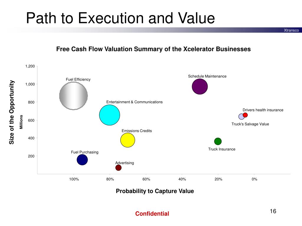 Path to Execution and Value Free Cash Flow Valuation Summary of the Xcelerator Businesses 1,200 Schedule Maintenance Fuel Efficiency 1,000 Entertainment & Communications 800 Drivers health insurance Size of the Opportunity 600 Millions Truck's Salvage Value Emissions Credits 400 Truck Insurance Fuel Purchasing 200 Advertising 100% 80% 60% 40% 20% 0% Probability to Capture Value