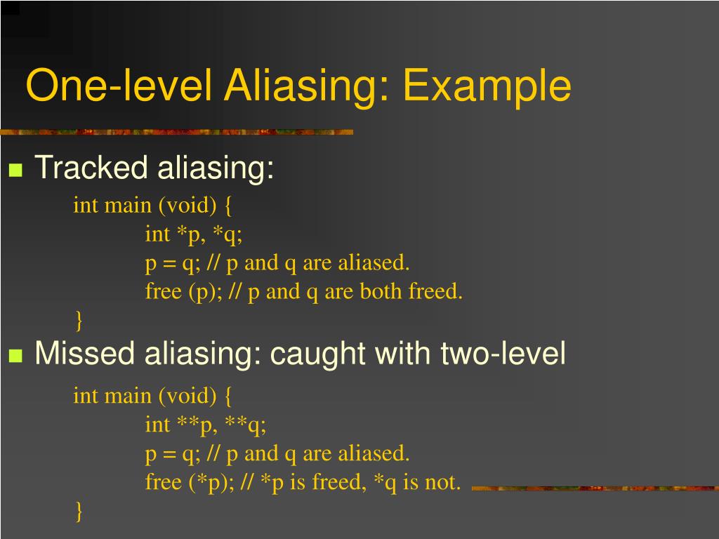 One-level Aliasing: Example • Tracked aliasing: int main (void) { int *p, *q; p = q; // p and q are aliased. free (p); // p and q are both freed. } p freed q