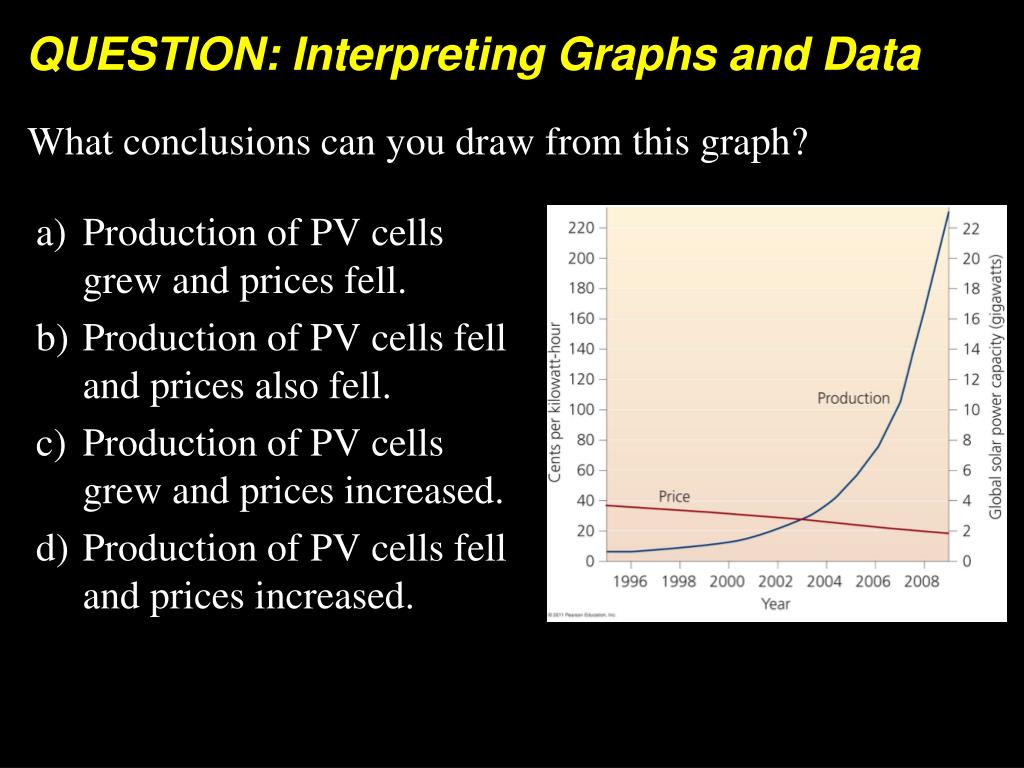 QUESTION: Interpreting Graphs and Data What conclusions can you draw from this graph? • Production of PV cells grew and prices fell. • Production of PV cells fell and prices also fell. • Production of PV cells grew and prices increased. • Production of PV cells fell and prices increased.
