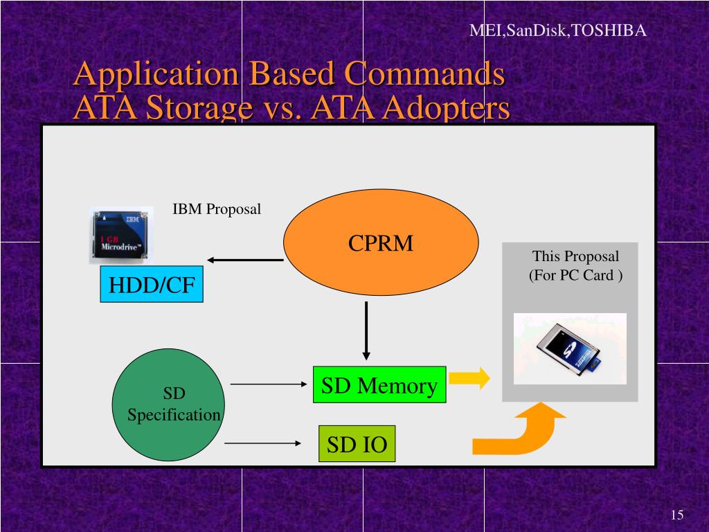 Application Based CommandsATA Storage vs. ATA Adopters IBM Proposal CPRM This Proposal(For PC Card ) HDD/CF SD Memory SDSpecification SD IO