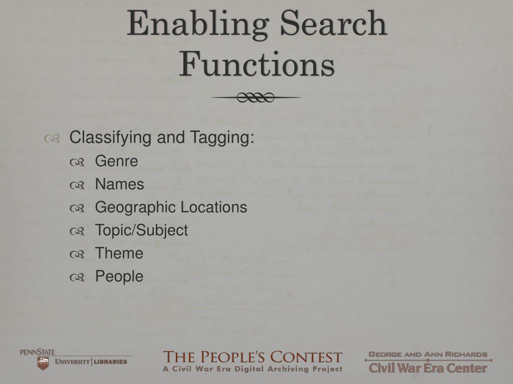 Enabling Search Functions • Classifying and Tagging: • Genre • Names • Geographic Locations • Topic/Subject • Theme • People