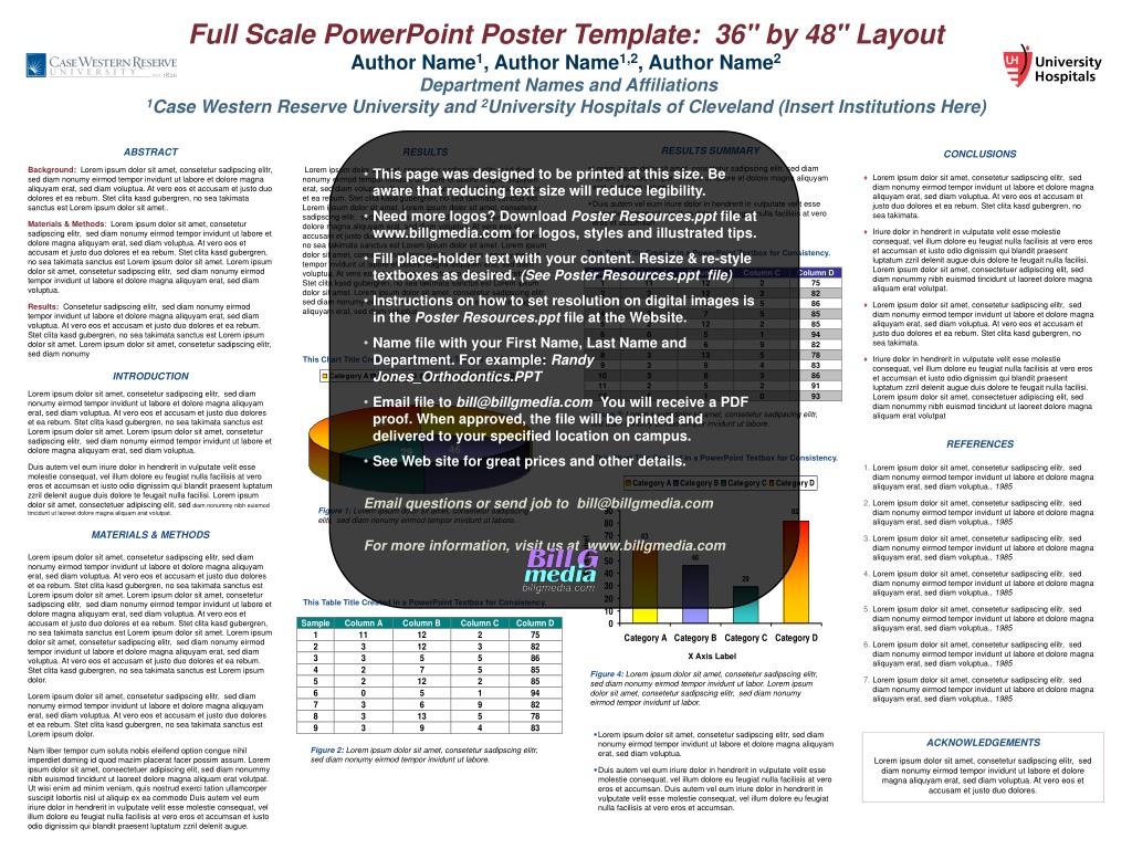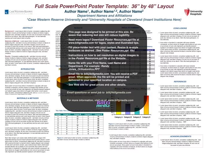 This page was designed to be printed at this size. Be aware that reducing text size will reduce legibility. • Need more logos? Download Poster Resources.ppt file at www.billgmedia.com for logos, styles and illustrated tips. • Fill place-holder text with your content. Resize & re-style textboxes as desired. (See Poster Resources.ppt file) • Instructions on how to set resolution on digital images is in the Poster Resources.ppt file at the Website. • Name file with your First Name, Last Name and Department. For example: Randy Jones_Orthodontics.PPT • Email file to bill@billgmedia.com You will receive a PDF proof. When approved, the file will be printed and delivered to your specified location on campus. • See Web site for great prices and other details. • Email questions or send job to bill@billgmedia.com • For more information, visit us at www.billgmedia.com Full Scale PowerPoint Poster Template: 36" by 48" Layout Author Name1, Author Name1,2, Author Name2 Department Names and Affiliations 1Case Western Reserve University and 2University Hospitals of Cleveland (Insert Institutions Here) ABSTRACT Background: Lorem ipsum dolor sit amet, consetetur sadipscing elitr, sed diam nonumy eirmod tempor invidunt ut labore et dolore magna aliquyam erat, sed diam voluptua. At vero eos et accusam et justo duo dolores et ea rebum. Stet clita kasd gubergren, no sea takimata sanctus est Lorem ipsum dolor sit amet.. Materials &Methods: Lorem ipsum dolor sit amet, consetetur sadipscing elitr, sed diam nonumy eirmod tempor invidunt ut labore et dolore magna aliquyam erat, sed diam voluptua. At vero eos et accusam et justo duo dolores et ea rebum. Stet clita kasd gubergren, no sea takimata sanctus est Lorem ipsum dolor sit amet. Lorem ipsum dolor sit amet, consetetur sadipscing elitr, sed diam nonumy eirmod tempor invidunt ut labore et dolore magna aliquyam erat, sed diam voluptua. Results: Consetetur sadipscing elitr, sed diam nonumy eirmod tempor invidunt ut labore et dolore magna aliquyam erat, sed diam voluptua. At vero eos et accusam et justo duo dolores et ea rebum. Stet clita kasd gubergren, no sea takimata sanctus est Lorem ipsum dolor sit amet. Lorem ipsum dolor sit amet, consetetur sadipscing elitr, sed diam nonumy INTRODUCTION Lorem ipsum dolor sit amet, consetetur sadipscing elitr, sed diam nonumy eirmod tempor invidunt ut labore et dolore magna aliquyam erat, sed diam voluptua. At vero eos et accusam et justo duo dolores et ea rebum. Stet clita kasd gubergren, no sea takimata sanctus est Lorem ipsum dolor sit amet. Lorem ipsum dolor sit amet, consetetur sadipscing elitr, sed diam nonumy eirmod tempor invidunt ut labore et dolore magna aliquyam erat, sed diam voluptua. Duis autem vel eum iriure dolor in hendrerit in vulputate velit esse molestie consequat, vel illum dolore eu feugiat nulla facilisis at vero eros et accumsan et iusto odio dignissim qui blandit praesent luptatum zzril delenit augue duis dolore te feugait nulla facilisi. Lorem ipsum dolor sit amet, consectetuer adipiscing elit, sed diam nonummy nibh euismod tincidunt ut laoreet dolore magna aliquam erat volutpat. MATERIALS & METHODS Lorem ipsum dolor sit amet, consetetur sadipscing elitr, sed diam nonumy eirmod tempor invidunt ut labore et dolore magna aliquyam erat, sed diam voluptua. At vero eos et accusam et justo duo dolores et ea rebum. Stet clita kasd gubergren, no sea takimata sanctus est Lorem ipsum dolor sit amet. Lorem ipsum dolor sit amet, consetetur sadipscing elitr, sed diam nonumy eirmod tempor invidunt ut labore et dolore magna aliquyam erat, sed diam voluptua. At vero eos et accusam et justo duo dolores et ea rebum. Stet clita kasd gubergren, no sea takimata sanctus est Lorem ipsum dolor sit amet. Lorem ipsum dolor sit amet, consetetur sadipscing elitr, sed diam nonumy eirmod tempor invidunt ut labore et dolore magna aliquyam erat, sed diam voluptua. At vero eos et accusam et justo duo dolores et ea rebum. Stet clita kasd gubergren, no sea takimata sanctus est Lorem ipsum dolor. Lorem ipsum dolor sit amet, consetetur sadipscing elitr, sed diam nonumy eirmod tempor invidunt ut labore et dolore magna aliquyam erat, sed diam voluptua. At vero eos et accusam et justo duo dolores et ea rebum. Stet clita kasd gubergren, no sea takimata sanctus est Lorem ipsum dolor. Nam liber tempor cum soluta nobis eleifend option congue nihil imperdiet doming id quod mazim placerat facer possim assum. Lorem ipsum dolor sit amet, consectetuer adipiscing elit, sed diam nonummy nibh euismod tincidunt ut laoreet dolore magna aliquam erat volutpat. Ut wisi enim ad minim veniam, quis nostrud exerci tation ullamcorper suscipit lobortis nisl ut aliquip ex ea commodo Duis autem vel eum iriure dolor in hendrerit in vulputate velit esse molestie consequat, vel illum dolore eu feugiat nulla facilisis at vero eros et accumsan et iusto odio dignissim qui blandit praesent luptatum zzril delenit augue. RESULTS Lorem ipsum dolor sit amet, consetetur sadipscing elitr, sed diam nonumy eirmod tempor invidunt ut labore et dolore magna aliquyam erat, sed diam voluptua. At vero eos et accusam et justo duo dolores et ea rebum. Stet clita kasd gubergren, no sea takimata sanctus est Lorem ipsum dolor sit amet. Lorem ipsum dolor sit amet, consetetur sadipscing elitr, sed diam nonumy eirmod tempor invidunt ut labore et dolore magna aliquyam erat, sed diam voluptua. At vero eos et accusam et justo duo dolores et ea rebum. Stet clita kasd gubergren, no sea takimata sanctus est Lorem ipsum dolor sit amet. Lorem ipsum dolor sit amet, consetetur sadipscing elitr, sed diam nonumy eirmod tempor invidunt ut labore et dolore magna aliquyam erat, sed diam voluptua. At vero eos et accusam et justo duo dolores et ea rebum. Stet clita kasd gubergren, no sea takimata sanctus est Lorem ipsum dolor sit amet. Lorem ipsum dolor sit amet, consetetur sadipscing elitr, sed diam nonumy eirmod tempor invidunt ut labore et dolore magna aliquyam erat, sed diam voluptua. • C