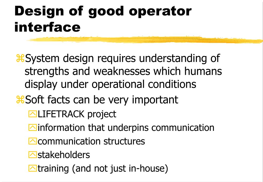 Design of good operator interface • System design requires understanding of strengths and weaknesses which humans display under operational conditions • Soft facts can be very important • LIFETRACK project • information that underpins communication • communication structures • stakeholders • training (and not just in-house)