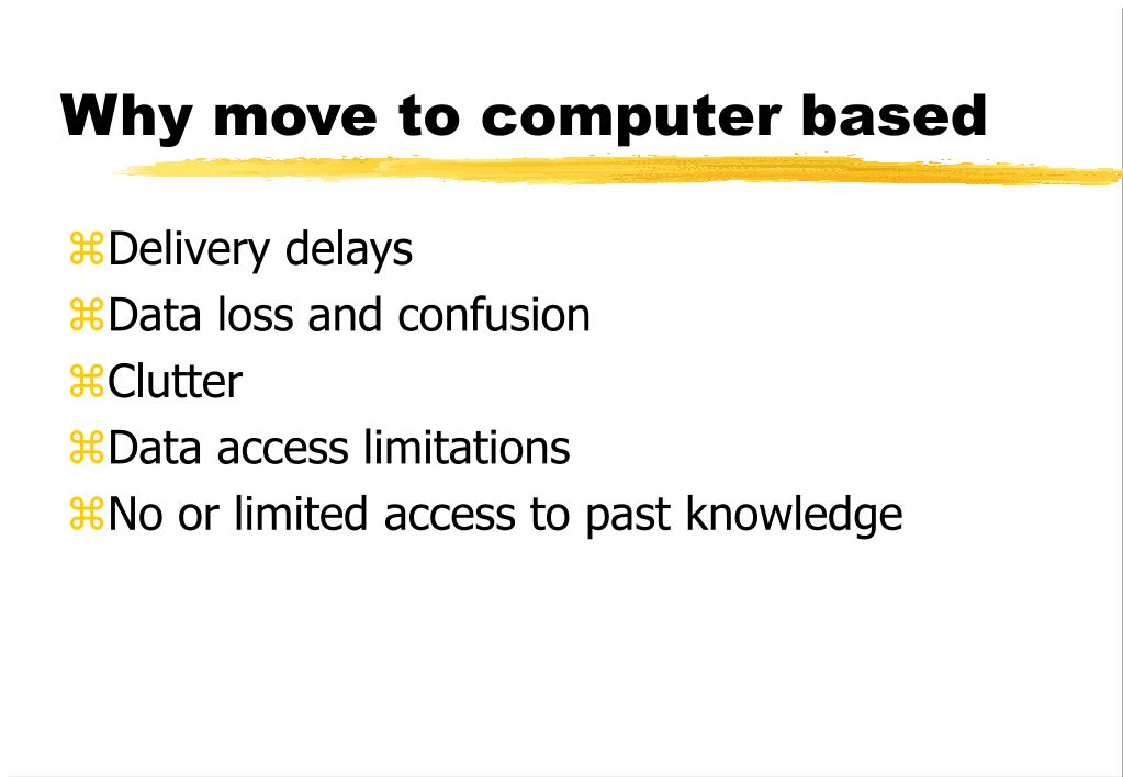 Why move to computer based • Delivery delays • Data loss and confusion • Clutter • Data access limitations • No or limited access to past knowledge