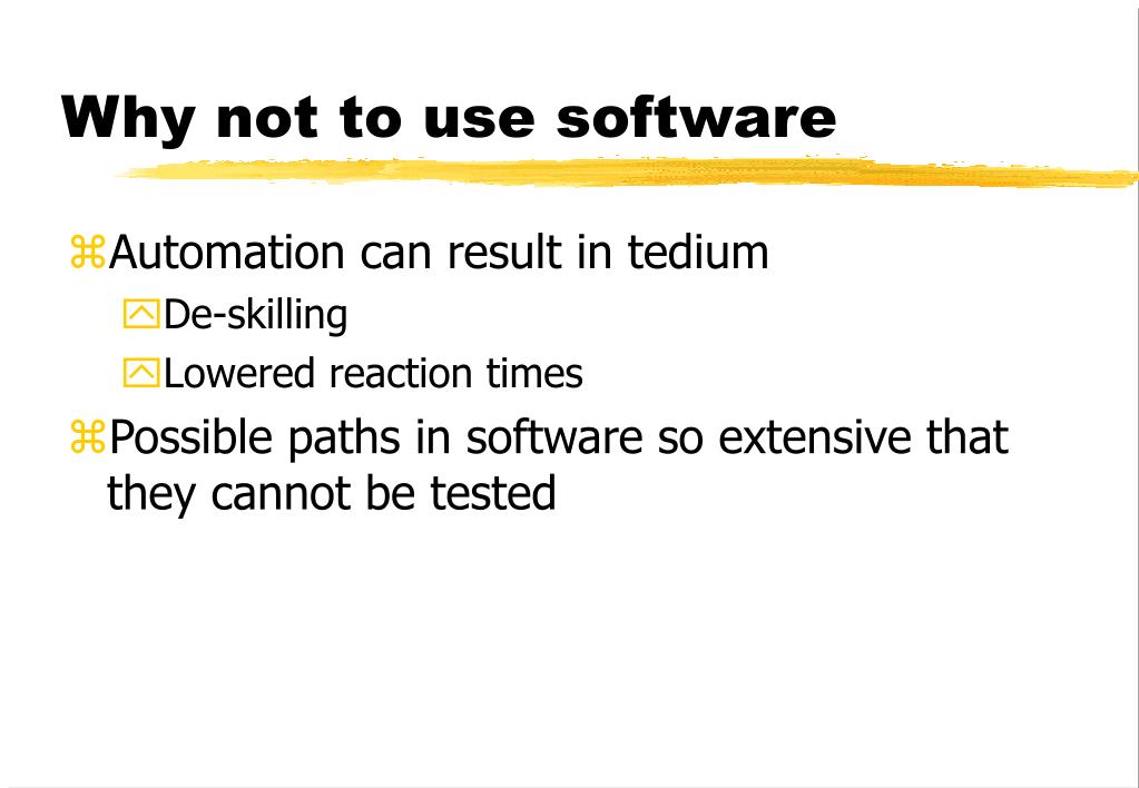 Why not to use software • Automation can result in tedium • De-skilling • Lowered reaction times • Possible paths in software so extensive that they cannot be tested