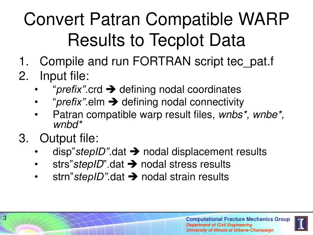 Loading Patran Compatible WARP Result Files in TecPlot. June 18, 2007. Objectives. To plot FE mesh and stress/strain/displacement contours in Tecplot 360, using the patran compatible binary result files generated by the WARP3D analysis. Convert Patran Compatible WARP Results to Tecplot Data.