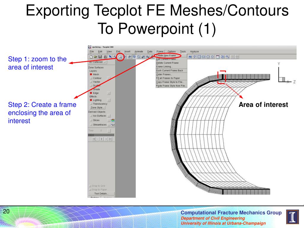 Exporting Tecplot FE Meshes/Contours To Powerpoint (1) Step 1: zoom to the area of interest Step 2: Create a frame enclosing the area of interest Area of interest