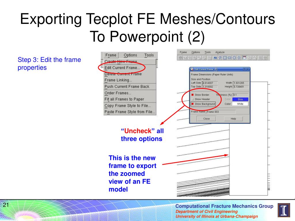 Exporting Tecplot FE Meshes/Contours To Powerpoint (2) Step 3: Edit the frame properties “Uncheck” all three options This is the new frame to export the zoomed view of an FE model