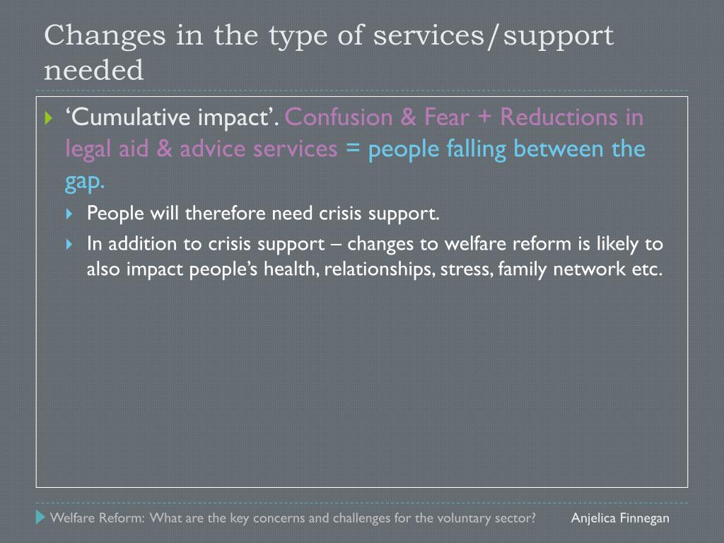 Changes in the type of services/support needed • ‘Cumulative impact’. Confusion & Fear + Reductions in legal aid & advice services = people falling between the gap. • People will therefore need crisis support. • In addition to crisis support – changes to welfare reform is likely to also impact people’s health, relationships, stress, family network etc.
