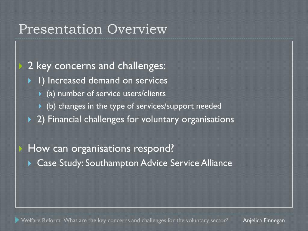 Welfare Reform: What are the key concerns and challenges for the voluntary sector?. Anjelica Finneg a n. Presentation Overview. 2 key concerns and challenges: 1) Increased demand on services (a) number of service users/clients (b) changes in the type of services/support needed