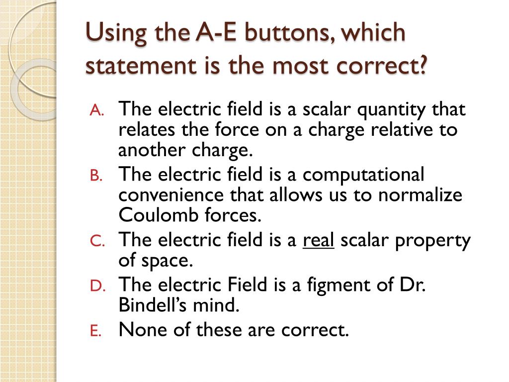 Using the A-E buttons, which statement is the most correct? • The electric field is a scalar quantity that relates the force on a charge relative to another charge. • The electric field is a computational convenience that allows us to normalize Coulomb forces. • The electric field is a real scalar property of space. • The electric Field is a figment of Dr. Bindell’s mind. • None of these are correct.