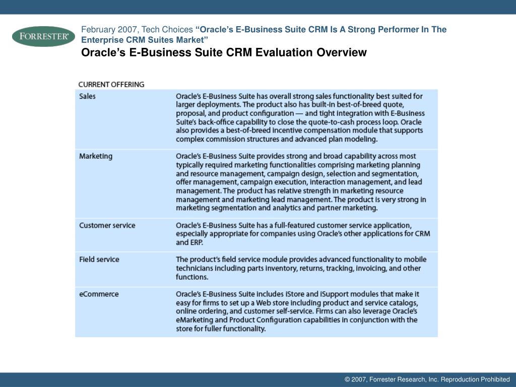 February 2007, Tech Choices “Oracle’s E-Business Suite CRM Is A Strong Performer In The Enterprise CRM Suites Market” Oracle’s E-Business Suite CRM Evaluation Overview