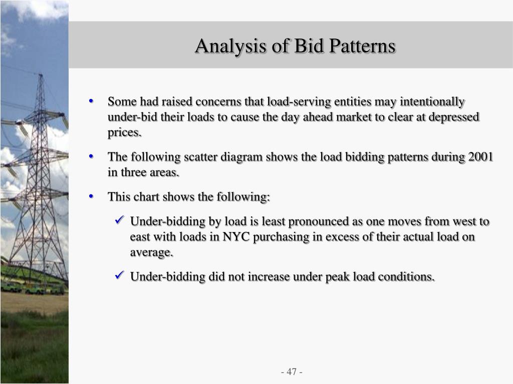 Some had raised concerns that load-serving entities may intentionally under-bid their loads to cause the day ahead market to clear at depressed prices. The following scatter diagram shows the load bidding patterns during 2001 in three areas. This chart shows the following: Under-bidding by load is least pronounced as one moves from west to east with loads in NYC purchasing in excess of their actual load on average. Under-bidding did not increase under peak load conditions. Analysis of Bid Patterns