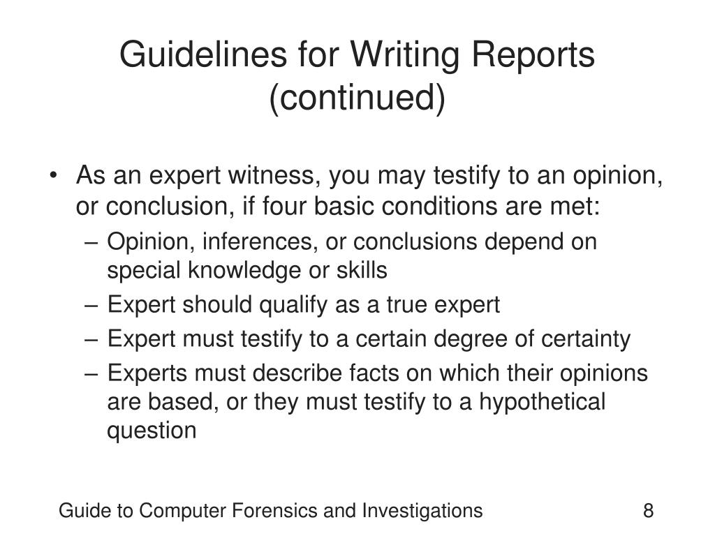 Guidelines for Writing Reports (continued) • As an expert witness, you may testify to an opinion, or conclusion, if four basic conditions are met: • Opinion, inferences, or conclusions depend on special knowledge or skills • Expert should qualify as a true expert • Expert must testify to a certain degree of certainty • Experts must describe facts on which their opinions are based, or they must testify to a hypothetical question Guide to Computer Forensics and Investigations