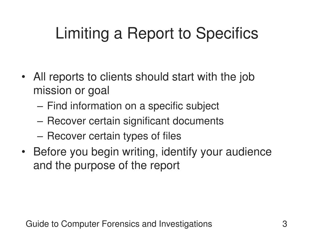 Limiting a Report to Specifics • All reports to clients should start with the job mission or goal • Find information on a specific subject • Recover certain significant documents • Recover certain types of files • Before you begin writing, identify your audience and the purpose of the report Guide to Computer Forensics and Investigations