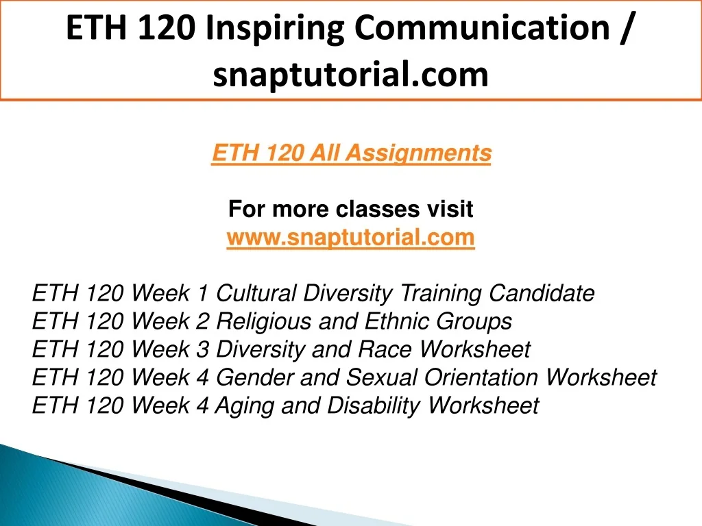 ETH 120 Inspiring Communication / snaptutorial.com ETH 120 All Assignments For more classes visit www.snaptutorial.com ETH 120 Week 1 Cultural Diversity Training Candidate ETH 120 Week 2 Religious and Ethnic Groups ETH 120 Week 3 Diversity and Race Worksheet ETH 120 Week 4 Gender and Sexual Orientation Worksheet ETH 120 Week 4 Aging and Disability Worksheet