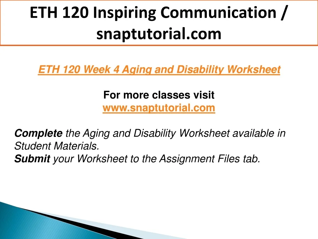 ETH 120 Inspiring Communication / snaptutorial.com ETH 120 Week 4 Aging and Disability Worksheet For more classes visit www.snaptutorial.com Complete the Aging and Disability Worksheet available in Student Materials. Submit your Worksheet to the Assignment Files tab.