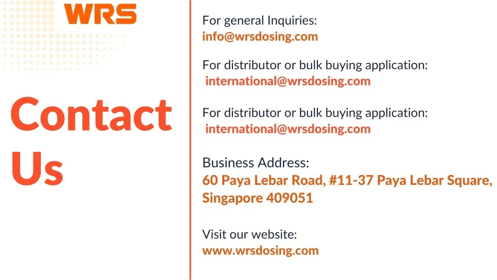 For general Inquiries: info@wrsdosing.com For distributor or bulk buying application: international@wrsdosing.com Contact Us For distributor or bulk buying application: international@wrsdosing.com Business Address: 60 Paya Lebar Road, #11-37 Paya Lebar Square, Singapore 409051 Visit our website: www.wrsdosing.com