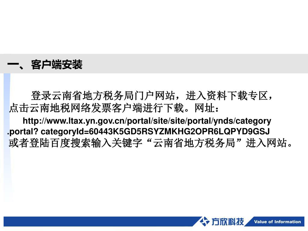 登录云南省地方税务局门户网站,进入资料下载专区,登录云南省地方税务局门户网站,进入资料下载专区, 点击云南地税网络发票客户端进行下载。网址: http://www.ltax.yn.gov.cn/portal/site/site/portal/ynds/category .portal?categoryId=60443K5GD5RSYZMKHG2OPR6LQPYD9GSJ 或者登陆百度搜索输入关键字“云南省地方税务局”进入网站。 一、客户端安装