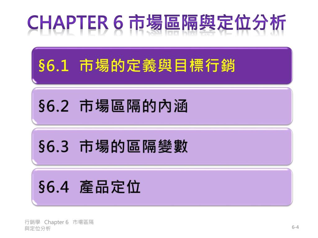 §6.2.1 市場區隔的定義 • 將一個異質的大市場區分為幾個小的同質群體或區隔市場的過程,稱為市場區隔。 • 市場區隔可以幫助行銷人員更精確地界定顧客的需求,如此使得行銷人員能夠更準確界定行銷目標和作好行銷的資源配置。