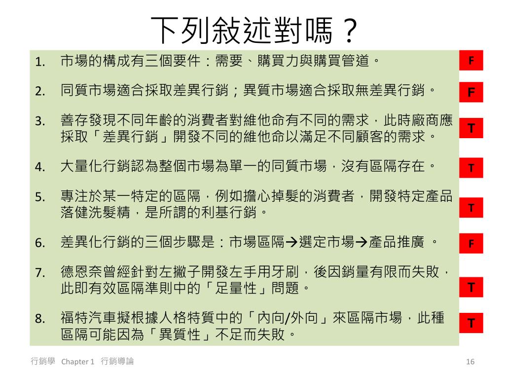 下列敍述對嗎? 市場的構成有三個要件:需要、購買力與購買管道。 同質市場適合採取差異行銷;異質市場適合採取無差異行銷。 善存發現不同年齡的消費者對維他命有不同的需求,此時廠商應採取「差異行銷」開發不同的維他命以滿足不同顧客的需求。 大量化行銷認為整個市場為單一的同質市場,沒有區隔存在。 專注於某一特定的區隔,例如擔心掉髮的消費者,開發特定產品落健洗髮精,是所謂的利基行銷。 差異化行銷的三個步驟是:市場區隔選定市場產品推廣。 德恩奈曾經針對左撇子開發左手用牙刷,後因銷量有限而失敗,此即有效區隔準則中的「足量性」問題。 福特汽車擬根據人格特質中的「內向/外向」來區隔市場,此種區隔可能因為「異質性」不足而失敗。 F F T T T F T T 行銷學 Chapter 1 行銷導論 16