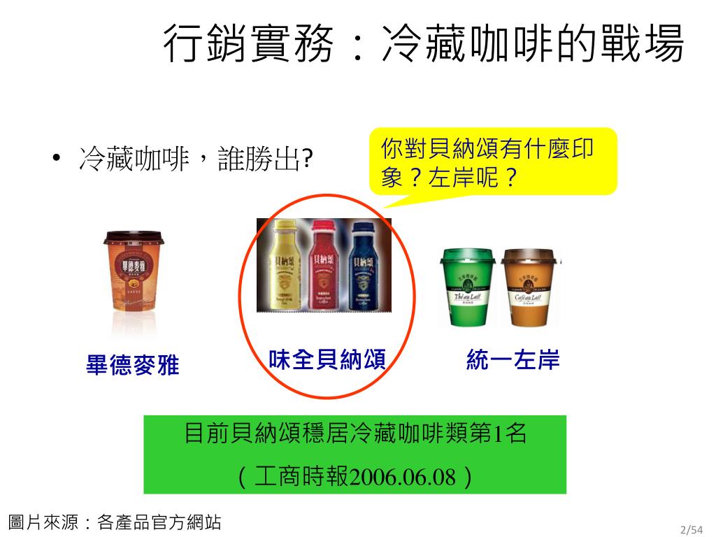行銷實務:冷藏咖啡的戰場 你對貝納頌有什麼印象?左岸呢? • 冷藏咖啡,誰勝出? 味全貝納頌 統一左岸 畢德麥雅 目前貝納頌穩居冷藏咖啡類第1名 (工商時報2006.06.08) 圖片來源:各產品官方網站