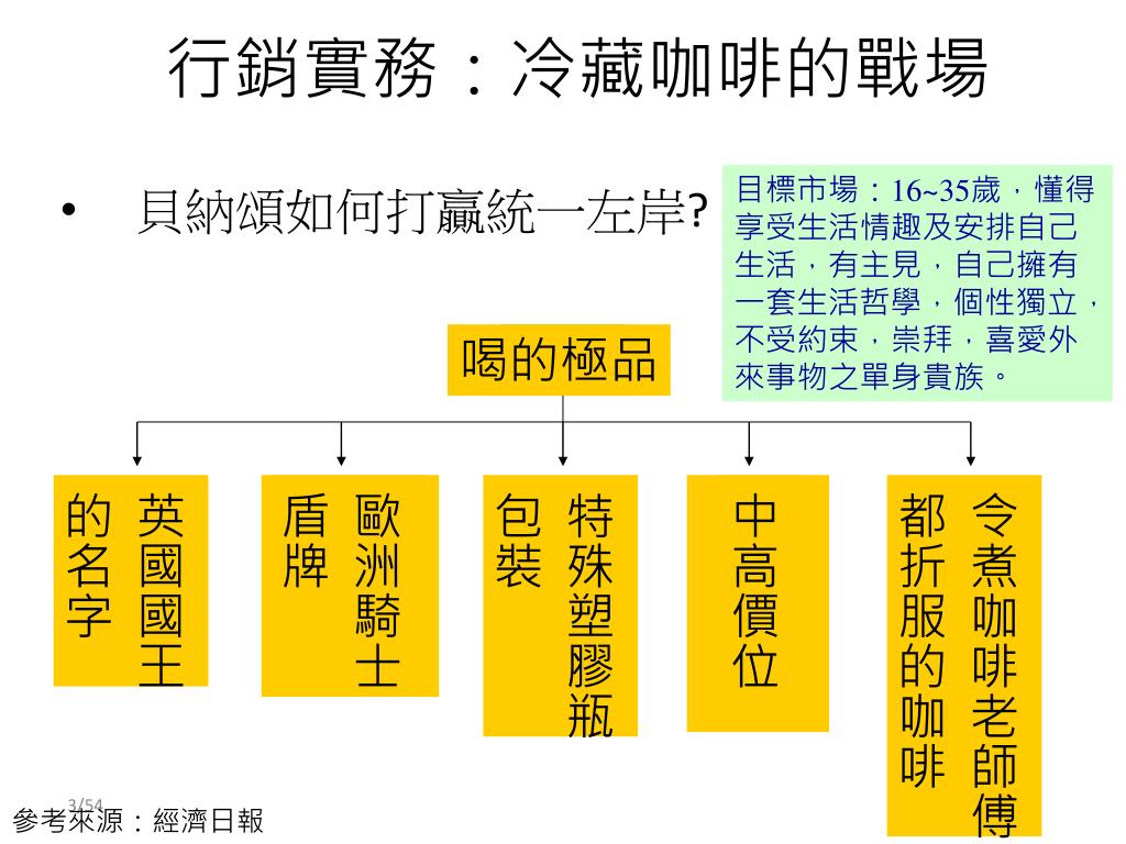 定位 LOGO 廣告 命名 包裝 價格 歐洲騎士 盾牌 中高價位 行銷實務:冷藏咖啡的戰場 目標市場:16~35歲,懂得享受生活情趣及安排自己生活,有主見,自己擁有一套生活哲學,個性獨立,不受約束,崇拜,喜愛外來事物之單身貴族。 • 貝納頌如何打贏統一左岸? 喝的極品 英國國王 的名字 特殊塑膠瓶 包裝 令煮咖啡老師傅 都折服的咖啡 參考來源:經濟日報