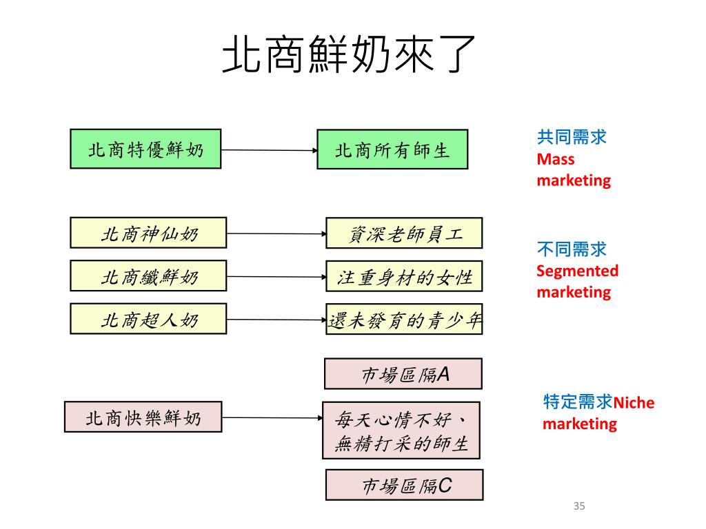 北商神仙奶 資深老師員工 市場區隔A 北商纖鮮奶 注重身材的女性 北商特優鮮奶 北商所有師生 北商快樂鮮奶 每天心情不好、 無精打采的師生 北商超人奶 還未發育的青少年 市場區隔C 北商鮮奶來了 共同需求 Mass marketing 不同需求Segmented marketing 特定需求Niche marketing