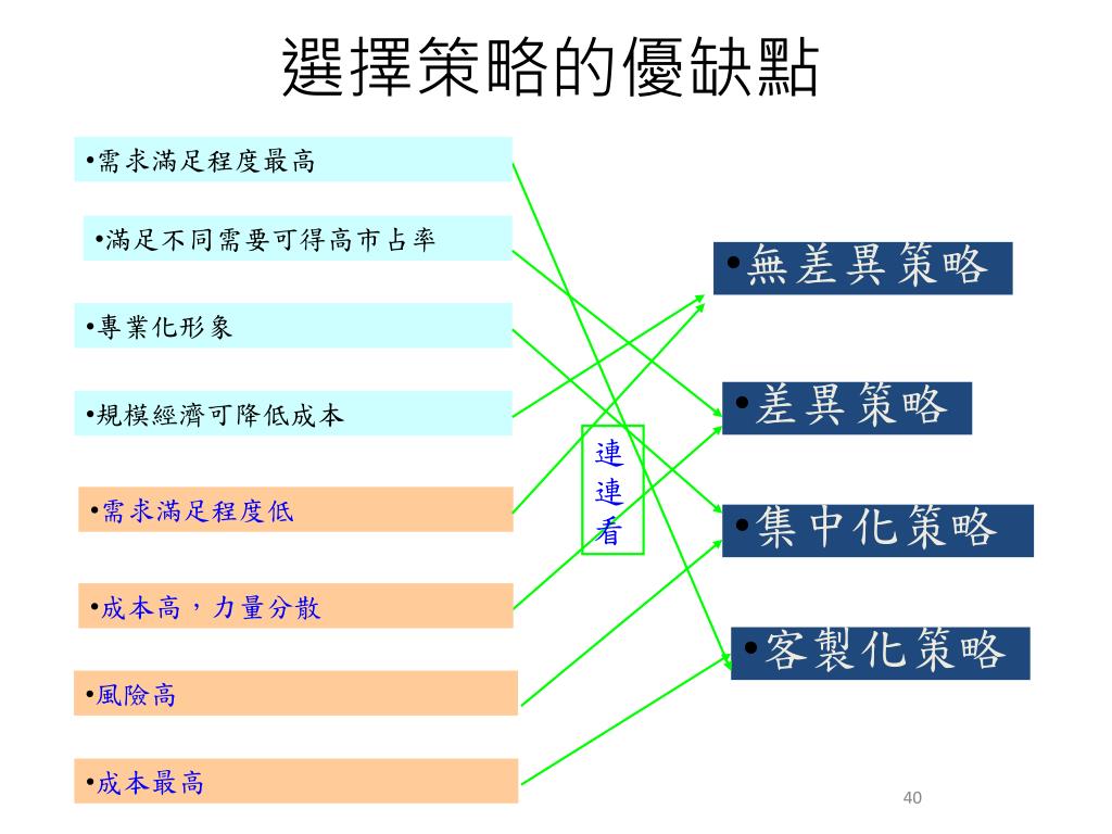選擇策略的優缺點 • 需求滿足程度最高 • 滿足不同需要可得高市占率 • 無差異策略 • 專業化形象 • 差異策略 • 規模經濟可降低成本 連連看 • 需求滿足程度低 • 集中化策略 • 成本高,力量分散 • 客製化策略 • 風險高 • 成本最高