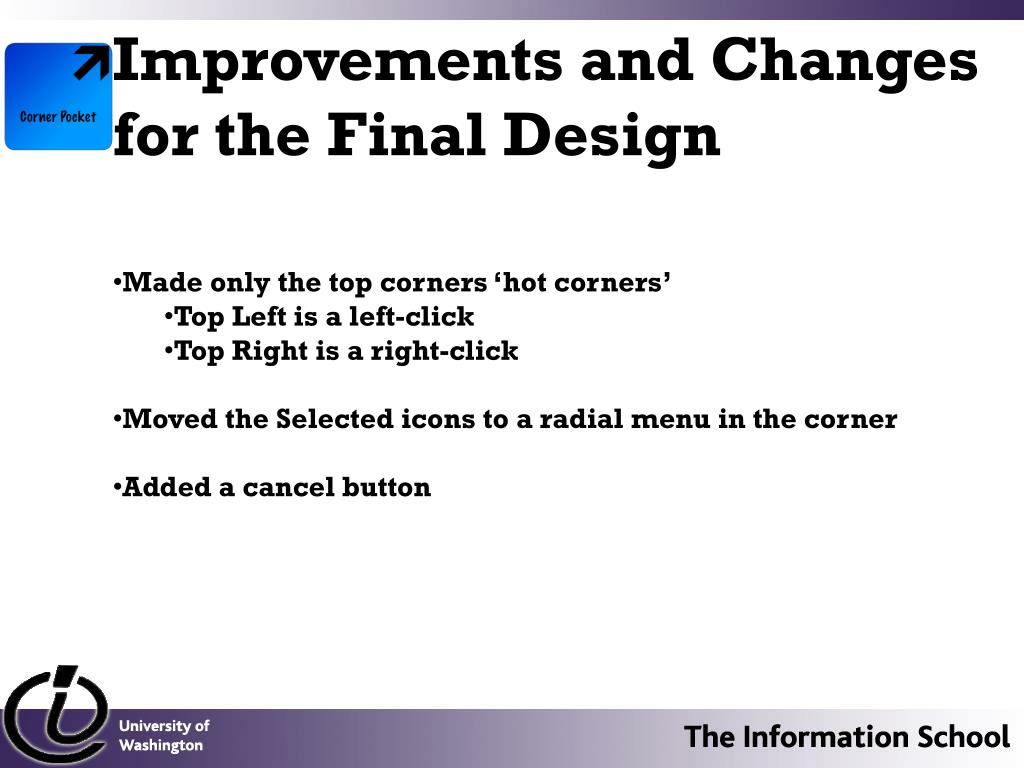 Improvements and Changes for the Final Design • Made only the top corners ‘hot corners’ • Top Left is a left-click • Top Right is a right-click • Moved the Selected icons to a radial menu in the corner • Added a cancel button
