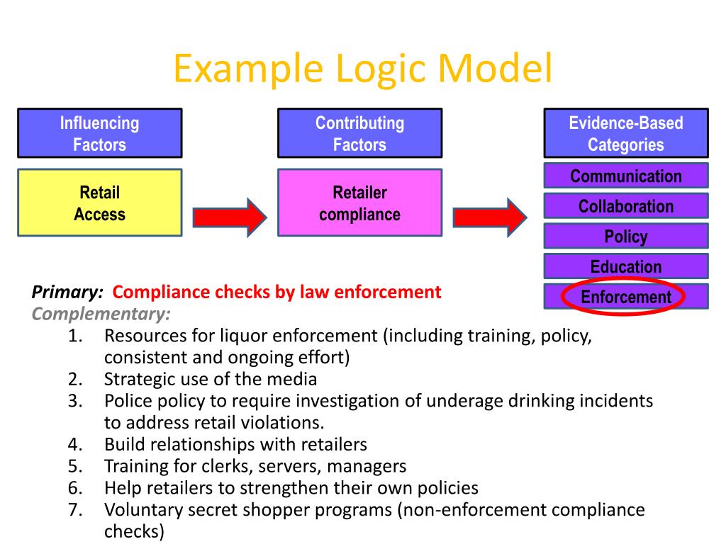 Example Logic Model Influencing Factors Contributing Factors Evidence-Based Categories Communication Retail Access Retailer compliance Collaboration Policy Education • Primary:Compliance checks by law enforcement • Complementary: • Resources for liquor enforcement (including training, policy, consistent and ongoing effort) • Strategic use of the media • Police policy to require investigation of underage drinking incidents to address retail violations. • Build relationships with retailers • Training for clerks, servers, managers • Help retailers to strengthen their own policies • Voluntary secret shopper programs (non-enforcement compliance checks) Enforcement