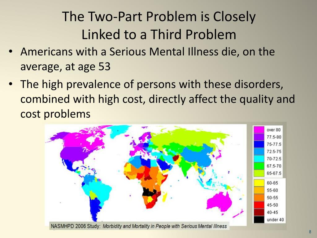 The Two-Part Problem is Closely Linked to a Third Problem • Americans with a Serious Mental Illness die, on the average, at age 53 • The high prevalence of persons with these disorders, combined with high cost, directly affect the quality and cost problems