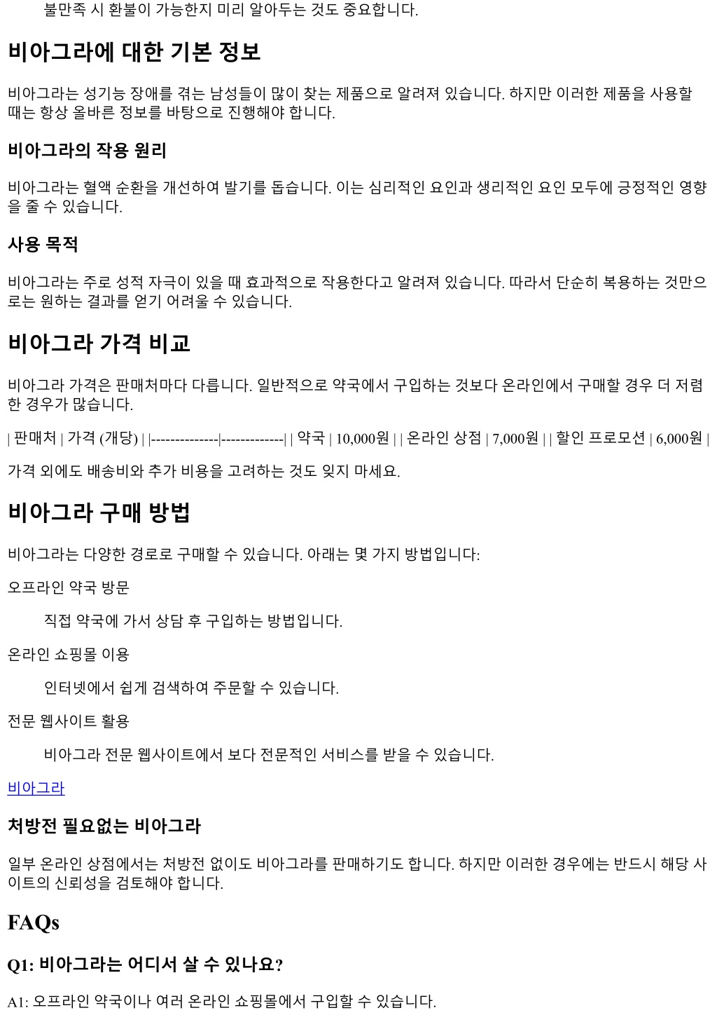 2. 불만족시환불이가능한지미리알아두는것도중요합니다.불만족시환불이가능한지미리알아두는것도중요합니다. 비아그라에대한기본정보 비아그라는성기능장애를겪는남성들이많이찾는제품으로알려져있습니다. 하지만이러한제품을사용할 때는항상올바른정보를바탕으로진행해야합니다. 비아그라의작용원리 비아그라는혈액순환을개선하여발기를돕습니다. 이는심리적인요인과생리적인요인모두에긍정적인영향 을줄수있습니다. 사용목적 비아그라는주로성적자극이있을때효과적으로작용한다고알려져있습니다. 따라서단순히복용하는것만으 로는원하는결과를얻기어려울수있습니다. 비아그라가격비교 비아그라가격은판매처마다다릅니다. 일반적으로약국에서구입하는것보다온라인에서구매할경우더저렴 한경우가많습니다. | 판매처 | 가격 (개당) | |--------------|-------------| | 약국 | 10,000원 | | 온라인상점 | 7,000원 | | 할인프로모션 | 6,000원 | 가격외에도배송비와추가비용을고려하는것도잊지마세요. 비아그라구매방법 비아그라는다양한경로로구매할수있습니다. 아래는몇가지방법입니다: 오프라인약국방문 직접약국에가서상담후구입하는방법입니다. 온라인쇼핑몰이용 인터넷에서쉽게검색하여주문할수있습니다. 전문웹사이트활용 비아그라전문웹사이트에서보다전문적인서비스를받을수있습니다. 비아그라 처방전필요없는비아그라 일부온라인상점에서는처방전없이도비아그라를판매하기도합니다. 하지만이러한경우에는반드시해당사 이트의신뢰성을검토해야합니다. FAQs Q1: 비아그라는어디서살수있나요? A1: 오프라인약국이나여러온라인쇼핑몰에서구입할수있습니다.