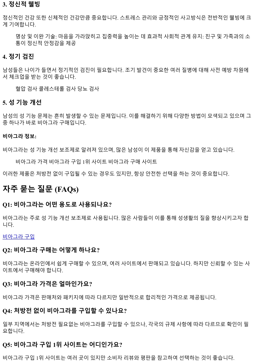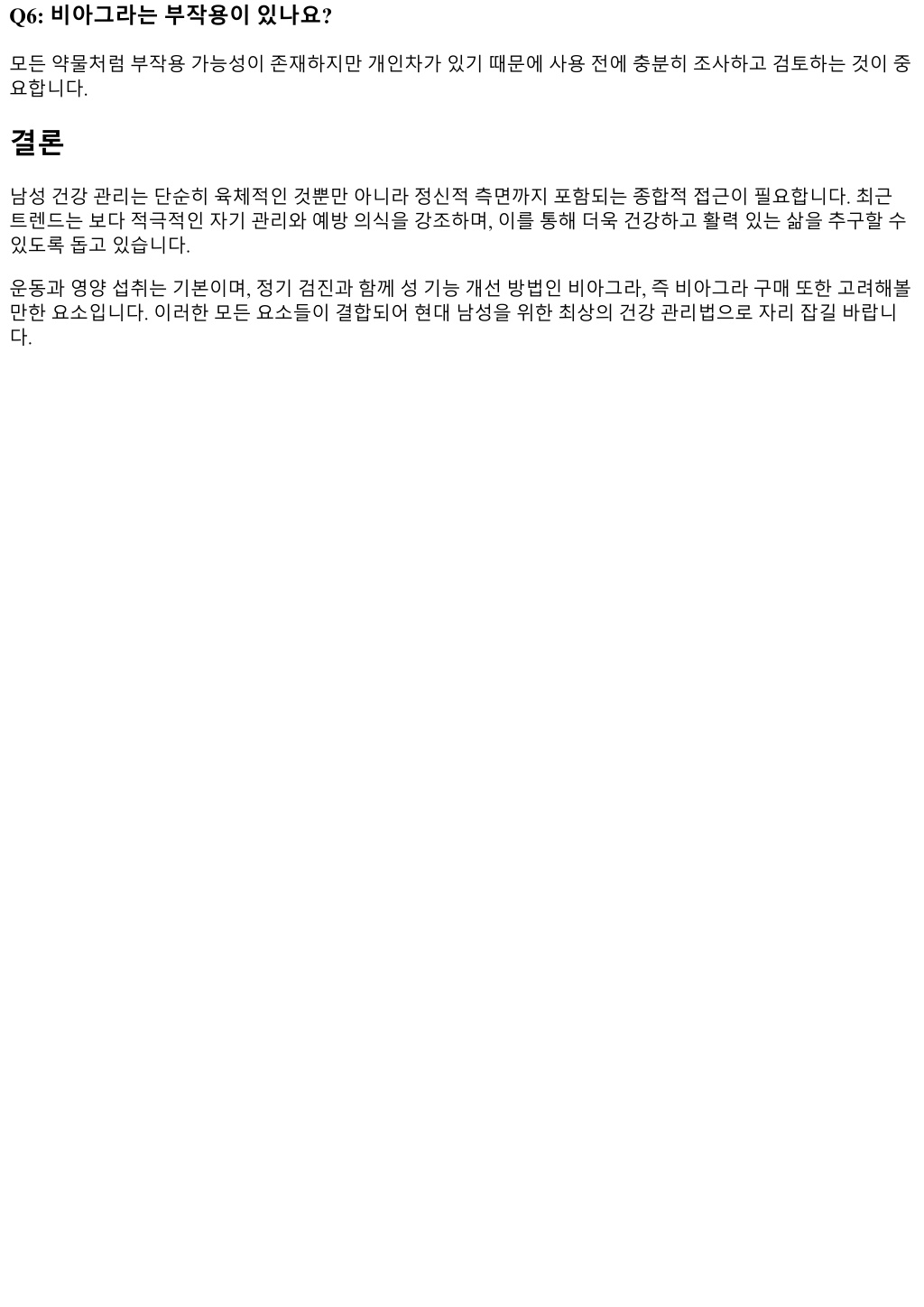 3. Q6: 비아그라는부작용이있나요? 모든약물처럼부작용가능성이존재하지만개인차가있기때문에사용전에충분히조사하고검토하는것이중 요합니다. 결론 남성건강관리는단순히육체적인것뿐만아니라정신적측면까지포함되는종합적접근이필요합니다. 최근 트렌드는보다적극적인자기관리와예방의식을강조하며, 이를통해더욱건강하고활력있는삶을추구할수 있도록돕고있습니다. 운동과영양섭취는기본이며, 정기검진과함께성기능개선방법인비아그라, 즉비아그라구매또한고려해볼 만한요소입니다. 이러한모든요소들이결합되어현대남성을위한최상의건강관리법으로자리잡길바랍니 다.