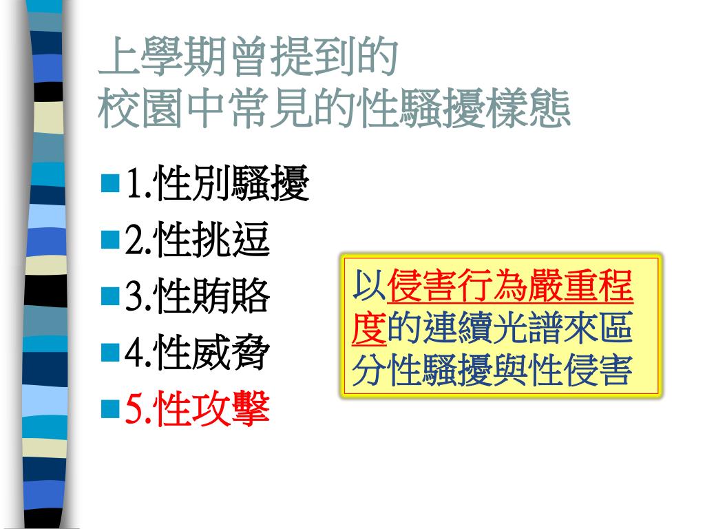 上學期曾提到的校園中常見的性騷擾樣態 以侵害行為嚴重程度的連續光譜來區分性騷擾與性侵害 1.性別騷擾 2.性挑逗 3.性賄賂 4.性威脅 5.性攻擊