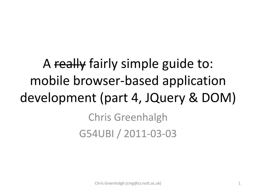 A really fairly simple guide to:mobile browser-based application development (part 4, JQuery & DOM) Chris Greenhalgh G54UBI / 2011-03-03 Chris Greenhalgh (cmg@cs.nott.ac.uk)