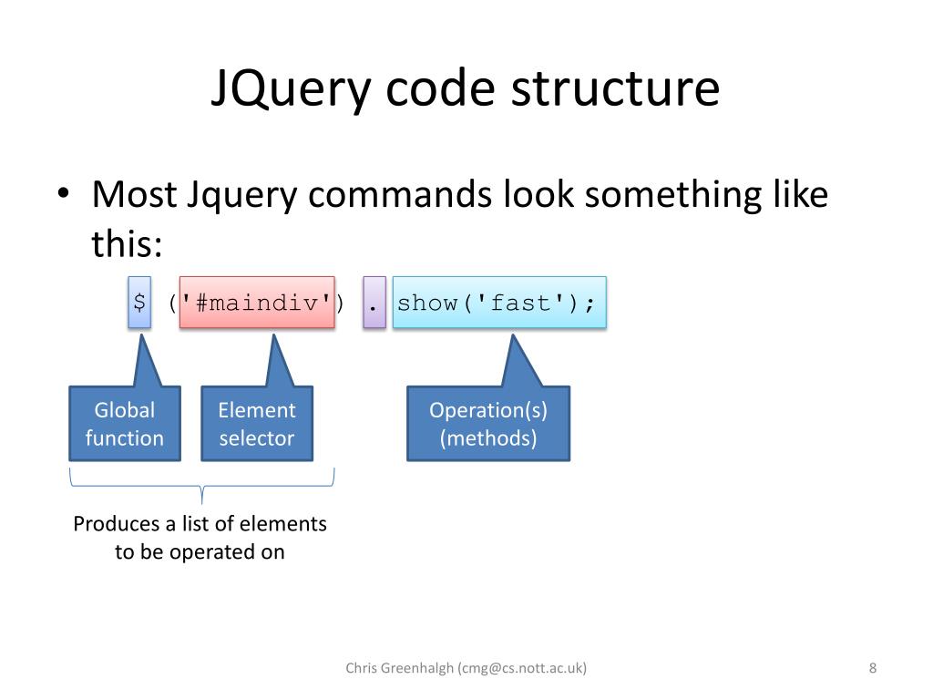 JQuery code structure • Most Jquery commands look something like this: $ ('#maindiv') . show('fast'); Global function Element selector Operation(s) (methods) Produces a list of elementsto be operated on Chris Greenhalgh (cmg@cs.nott.ac.uk)