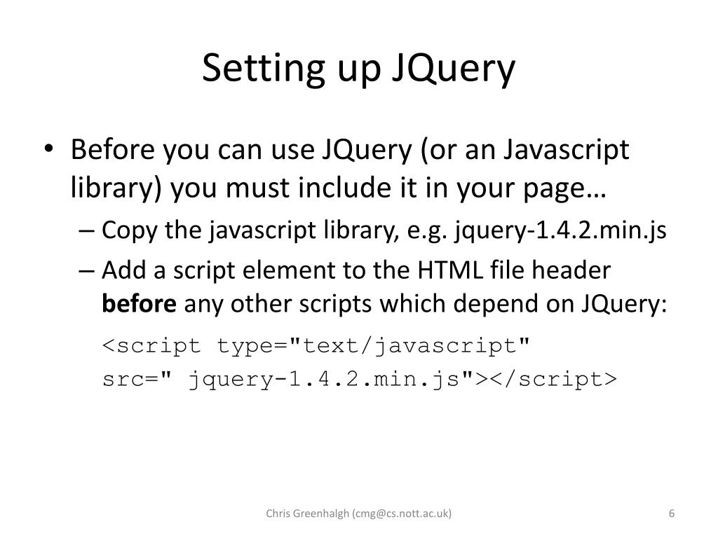 Setting up JQuery • Before you can use JQuery (or an Javascriptlibrary) you must include it in your page… • Copy the javascript library, e.g. jquery-1.4.2.min.js • Add a script element to the HTML file header before any other scripts which depend on JQuery: <script type="text/javascript" src=" jquery-1.4.2.min.js"></script> Chris Greenhalgh (cmg@cs.nott.ac.uk)