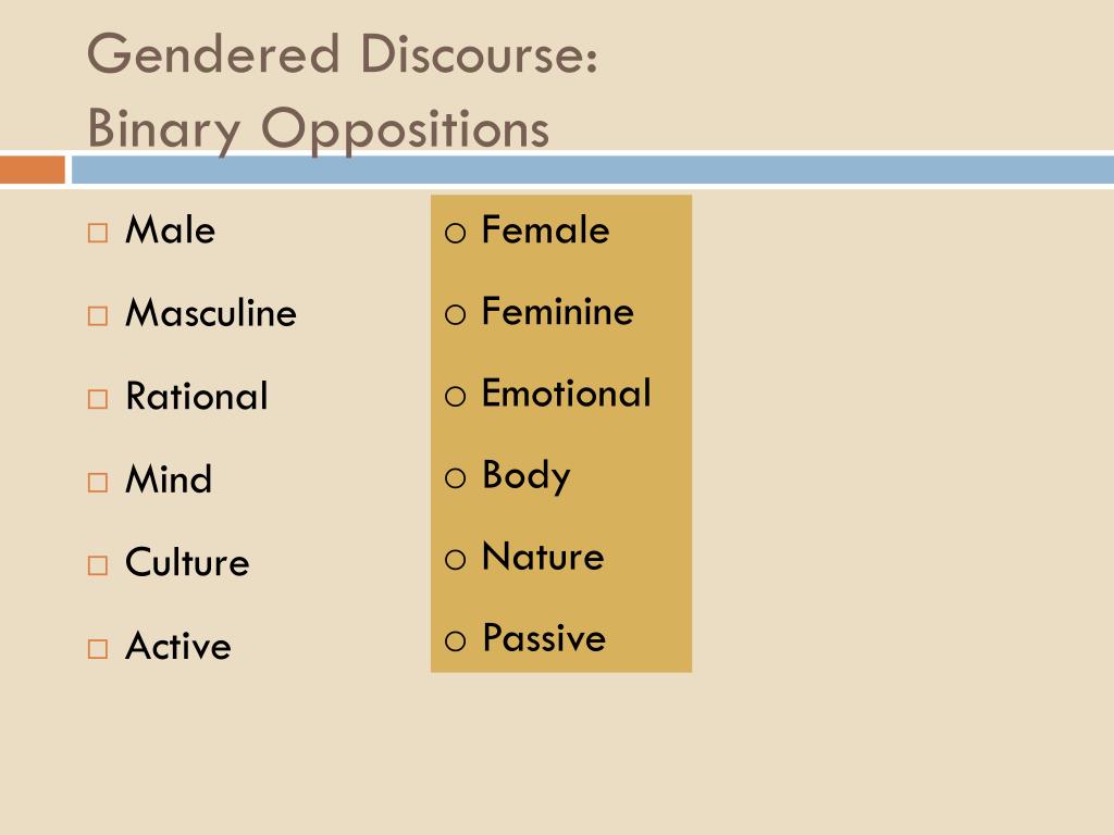 Gendered Discourse:Binary Oppositions • Male • Masculine • Rational • Mind • Culture • Active • Female • Feminine • Emotional • Body • Nature • Passive