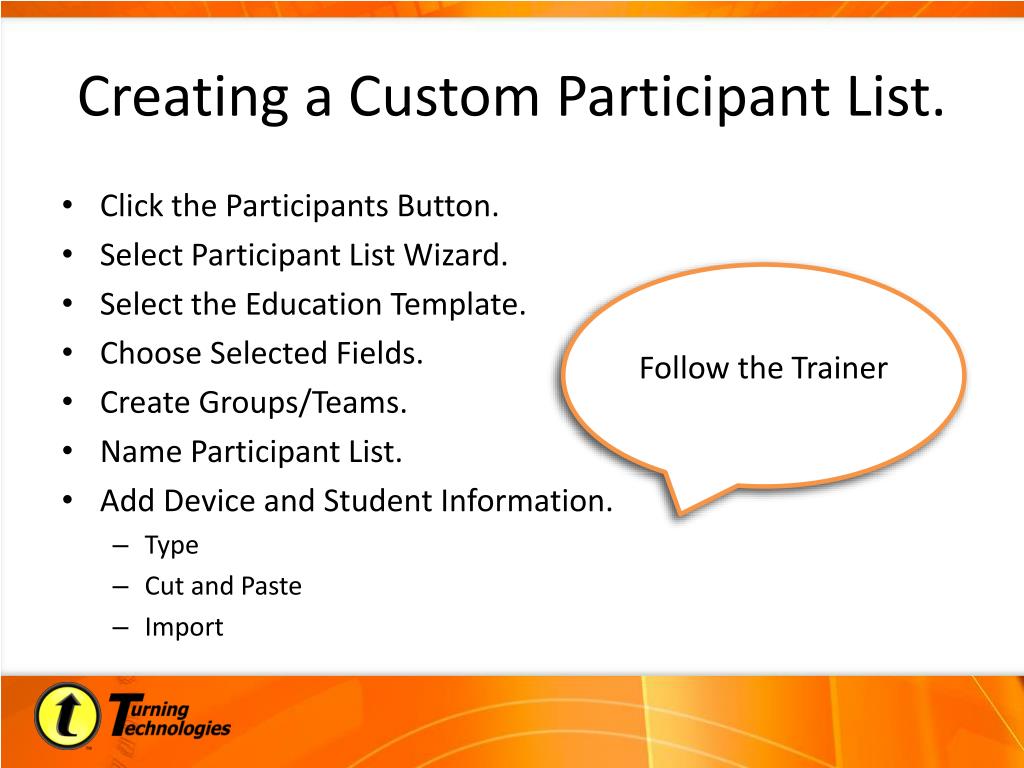 Creating a Custom Participant List. • Click the Participants Button. • Select Participant List Wizard. • Select the Education Template. • Choose Selected Fields. • Create Groups/Teams. • Name Participant List. • Add Device and Student Information. • Type • Cut and Paste • Import Follow the Trainer