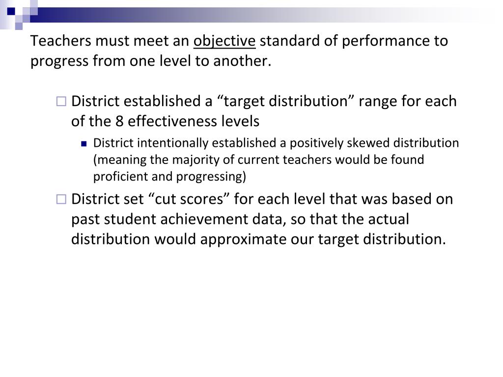 Teachers must meet an objective standard of performance to progress from one level to another. • District established a “target distribution” range for each of the 8 effectiveness levels • District intentionally established a positively skewed distribution (meaning the majority of current teachers would be found proficient and progressing) • District set “cut scores” for each level that was based on past student achievement data, so that the actual distribution would approximate our target distribution.
