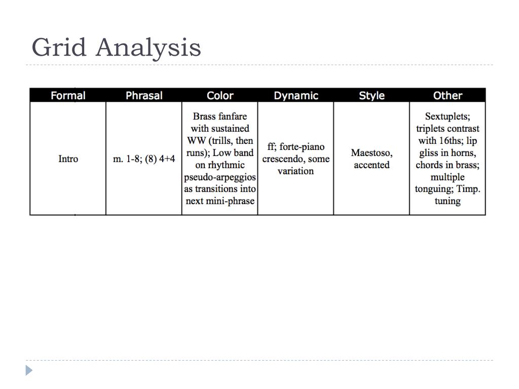 Grid Analysis (see Curnow on Compass) Formal: Intro Phrasal: Measures 1-8; (8) 4 + 4 Color: brass fanfare with sustained WW (trills, then runs); Low band on rhythmic pseudo-arpeggios as transitions into next mini-phrase Dynamics: ff; forte-piano crescendo, some variation Style:Maestoso, accented Other: Important interactions or rehearsal considerations?; sextuplets; triplets contrast with 16ths; lip gliss in horns, chords in brass (special issues?); multiple tonguing; Timp. tuning