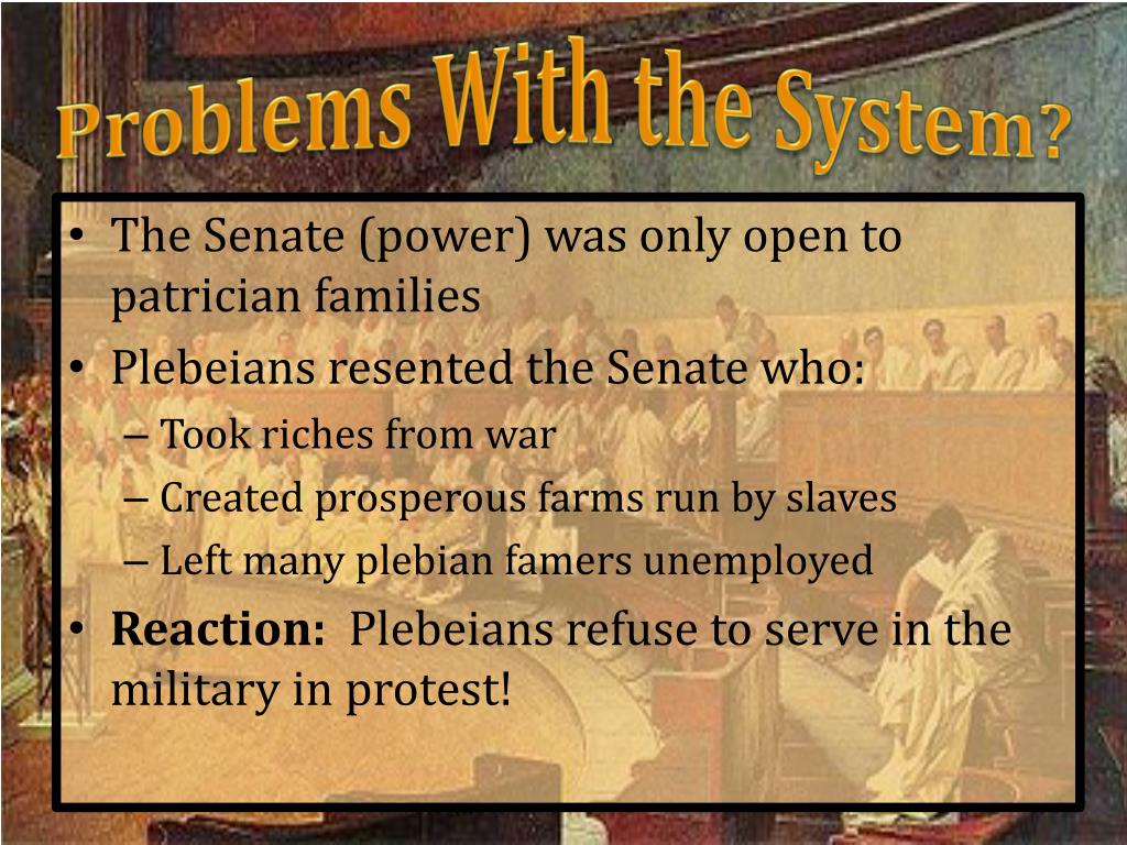 Problems With the System? • The Senate (power) was only open to patrician families • Plebeians resented the Senate who: • Took riches from war • Created prosperous farms run by slaves • Left many plebian famers unemployed • Reaction: Plebeians refuse to serve in the military in protest!