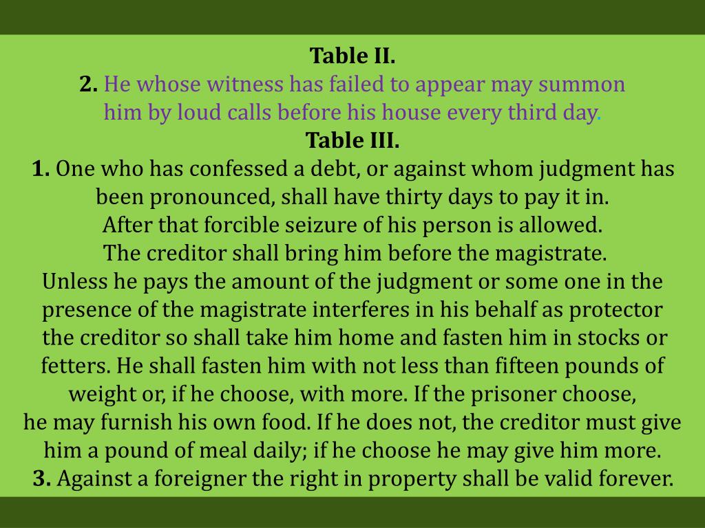 Table II.2.He whose witness has failed to appear may summon him by loud calls before his house every third day. Table III.1. One who has confessed a debt, or against whom judgment has been pronounced, shall have thirty days to pay it in. After that forcible seizure of his person is allowed. The creditor shall bring him before the magistrate. Unless he pays the amount of the judgment or some one in the presence of the magistrate interferes in his behalf as protector the creditor so shall take him home and fasten him in stocks or fetters. He shall fasten him with not less than fifteen pounds of weight or, if he choose, with more. If the prisoner choose, he may furnish his own food. If he does not, the creditor must give him a pound of meal daily; if he choose he may give him more.3. Against a foreigner the right in property shall be valid forever.