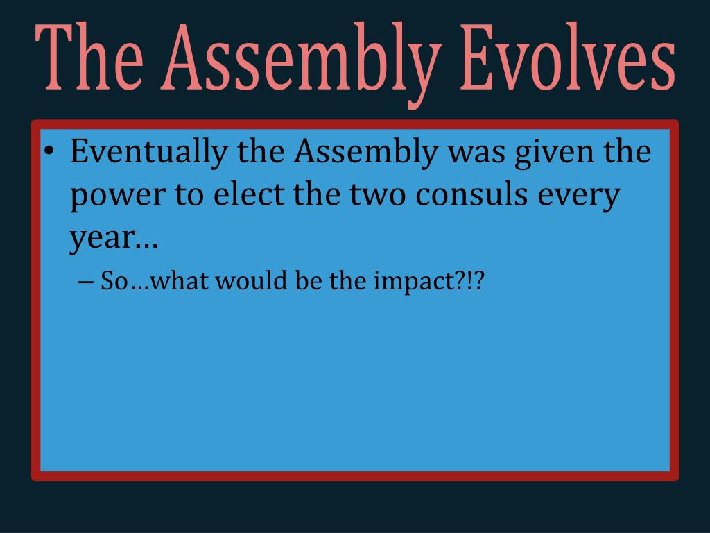 The Assembly Evolves • Eventually the Assembly was given the power to elect the two consuls every year… • So…what would be the impact?!?