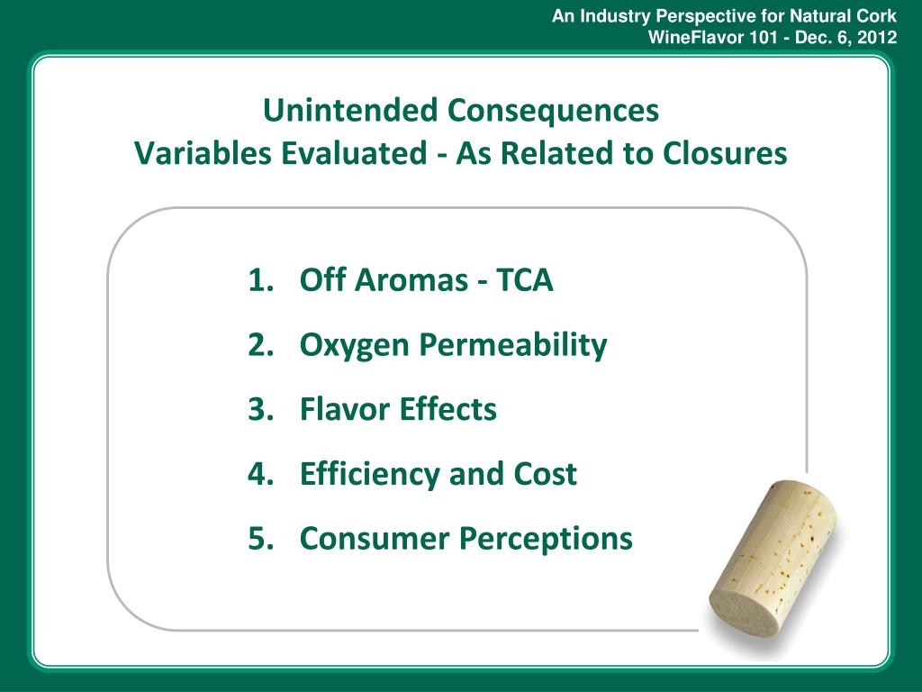 Unintended ConsequencesVariables Evaluated - As Related to Closures • Off Aromas - TCA • Oxygen Permeability • Flavor Effects • Efficiency and Cost • Consumer Perceptions