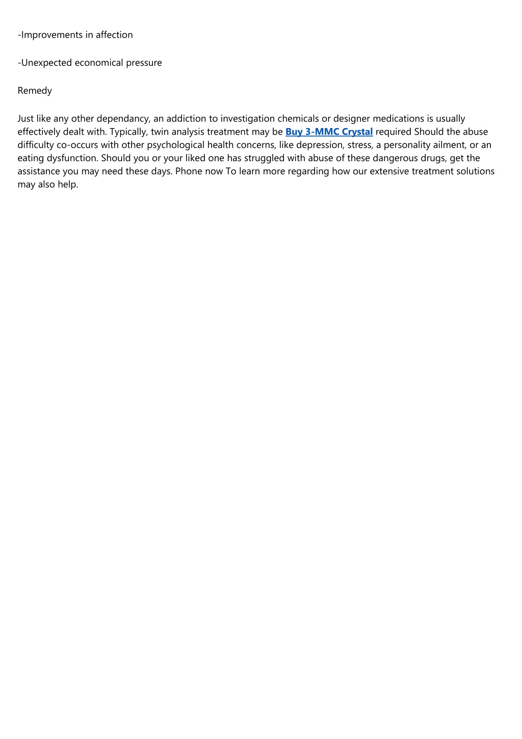 -Improvements in affection -Unexpected economical pressure Remedy Just like any other dependancy, an addiction to investigation chemicals or designer medications is usually effectively dealt with. Typically, twin analysis treatment may be Buy 3-MMC Crystal required Should the abuse difficulty co-occurs with other psychological health concerns, like depression, stress, a personality ailment, or an eating dysfunction. Should you or your liked one has struggled with abuse of these dangerous drugs, get the assistance you may need these days. Phone now To learn more regarding how our extensive treatment solutions may also help.